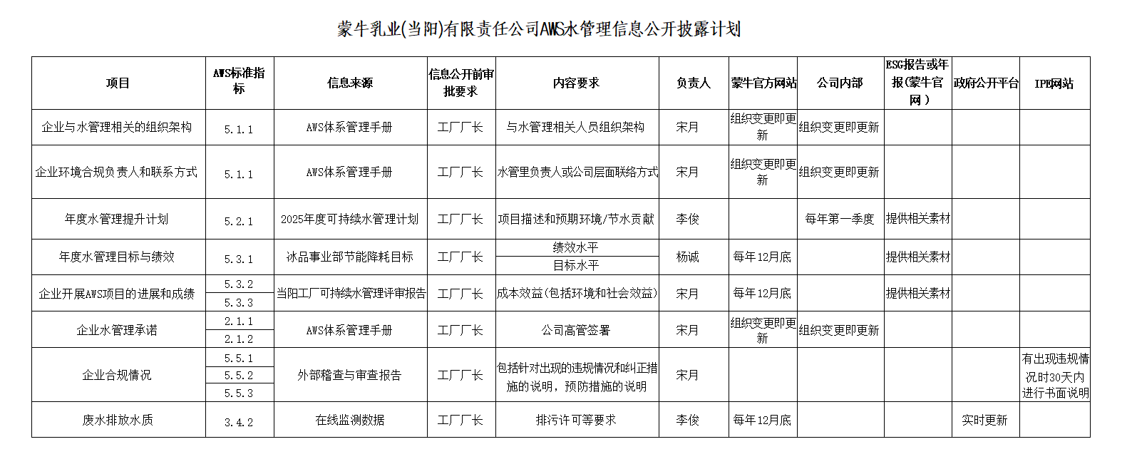 國(guó)際水管理聯(lián)盟(AWS)是企業(yè)、非政府組織及公共部門的全球成員合作體系。要求成員采用和推動(dòng)可持續(xù)利用水資源的通用框架——國(guó)際可持續(xù)水管理標(biāo)準(zhǔn)(“AWS 標(biāo)準(zhǔn)”),促進(jìn)當(dāng)?shù)厮Y源的可持續(xù)管理。 AWS標(biāo)準(zhǔn)的目標(biāo)是推動(dòng)可持續(xù)水管理,即通過各利益相關(guān)方參與,在場(chǎng)址和流域?qū)用娌扇⌒袆?dòng),實(shí)現(xiàn)社會(huì)和文化公平、環(huán)境可持續(xù)和經(jīng)濟(jì)有益的水資源開發(fā)利用。為有效應(yīng)對(duì)越來越嚴(yán)的水資源管理形勢(shì),提升全員節(jié)水意識(shí),組織實(shí)施AWS(國(guó)際可持續(xù)水管理認(rèn)證項(xiàng)目),冰品事業(yè)部承接集團(tuán)工作以當(dāng)陽工廠進(jìn)行認(rèn)證,需對(duì)以下信息進(jìn)行公開公示: