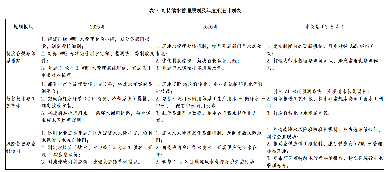 按照AWS可持續(xù)水管理體系,制度合規(guī)與體系搭建、數(shù)智技術(shù)與工藝節(jié)水、風(fēng)險(xiǎn)管控與全鏈協(xié)同,路線圖持續(xù)推進(jìn)。