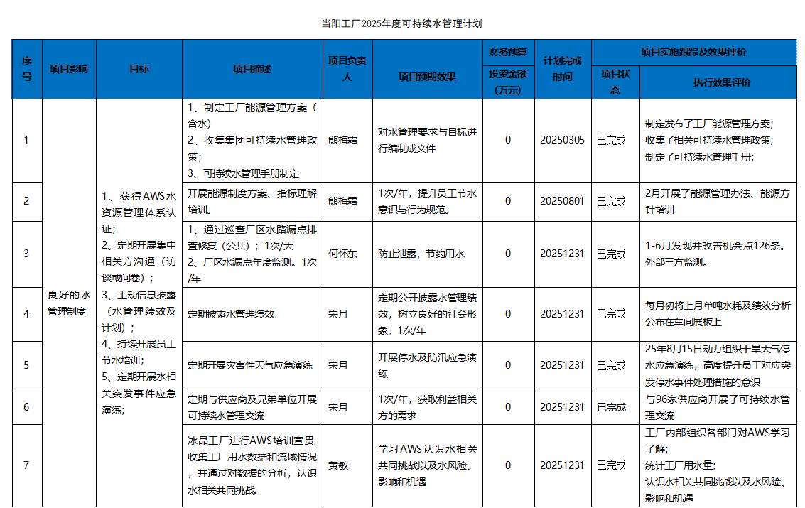 當(dāng)陽工廠可持續(xù)水管理方針與集團(tuán)能源方針一致:誠(chéng)信守法、綠色運(yùn)營(yíng),提質(zhì)增效、低碳發(fā)展。當(dāng)陽工廠可持續(xù)水管理目標(biāo)與集團(tuán)環(huán)保目標(biāo)一致:承擔(dān)企業(yè)社會(huì)責(zé)任,踐行綠色低碳運(yùn)營(yíng),實(shí)現(xiàn)可持續(xù)發(fā)展,種一顆百年綠色大樹。