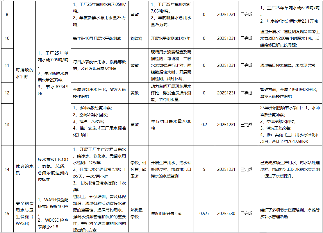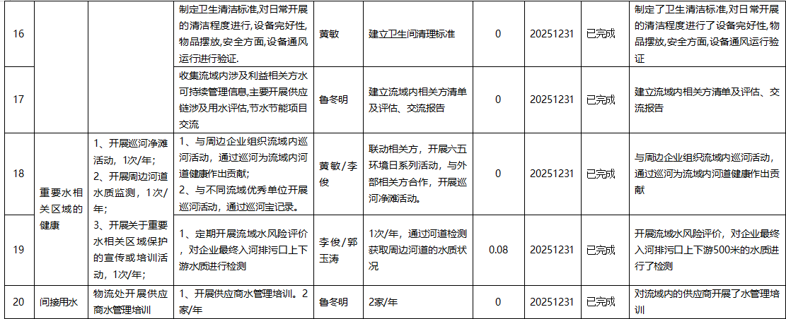 工廠2025年與流域內(nèi)共同相關(guān)方開展了多種活動(dòng),內(nèi)部開展了一百多人凈灘活動(dòng),4輪周邊企業(yè)水管理交流活動(dòng)參加人數(shù)八十多人,二十幾家相關(guān)方拜訪交流,收集到交流信息一百多條,完成企業(yè)節(jié)水再改進(jìn)及提升任務(wù)兩項(xiàng),挖掘出潛在再改進(jìn)項(xiàng)目一項(xiàng)。整體,2025年工廠可持續(xù)水管理在取得了較高的經(jīng)濟(jì)效益同時(shí),也取得了較好的社會(huì)效益。